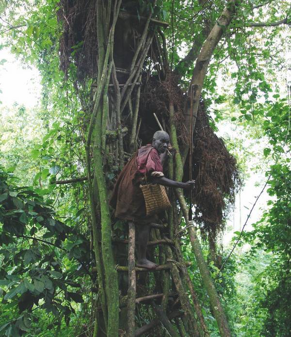 Простейшим типом жилья в Африке пользуются охотники-пигмеи, вынужденные постоянно перемещаться по экваториальному лесу в поисках новых удобных стоянок для охоты и сбора дикого мёда. Им нет нужды строить постоянные жилища. В ходе миграций в качестве естественного убежища используются пещеры и скальные навесы, где вся семья размещается на ночлег на земле, используя листья папоротника в качестве и постели, и подушек, и одеял, укрываясь ими полностью. Лишь после рождения ребёнка может быть сооружена небольшая хижина из листьев и сухой травы. Во многих случаях для защиты от диких зверей такую хижину для молодой матери строят на высоте, на развилке ветвей большого дерева.