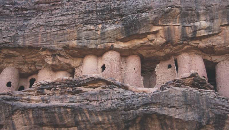 В пещерах на уступе Бандиагара в Западной Африке когда-то тоже жили люди, только не совсем обычные. Догоны – нынешние обитатели здешних мест – говорят, что десятки пещер, непостижимым образом выдолбленных на большой высоте в скальной породе, населяли теллемы, мифические летающие люди, обладавшие сверхъестественными способностями. При первом же взгляде заметно, что попасть в эти пещеры можно только по верёвкам, а выдолбить – только при помощи современной строительной техники, поэтому «пещеры теллемов» остаются одной из самых таинственных загадок Западной Африки. К сожалению, во многие из этих пещер доступ закрыт местными жрецами под страхом смерти, поэтому об их настоящем происхождении, способе изготовления и предназначении можно только догадываться.