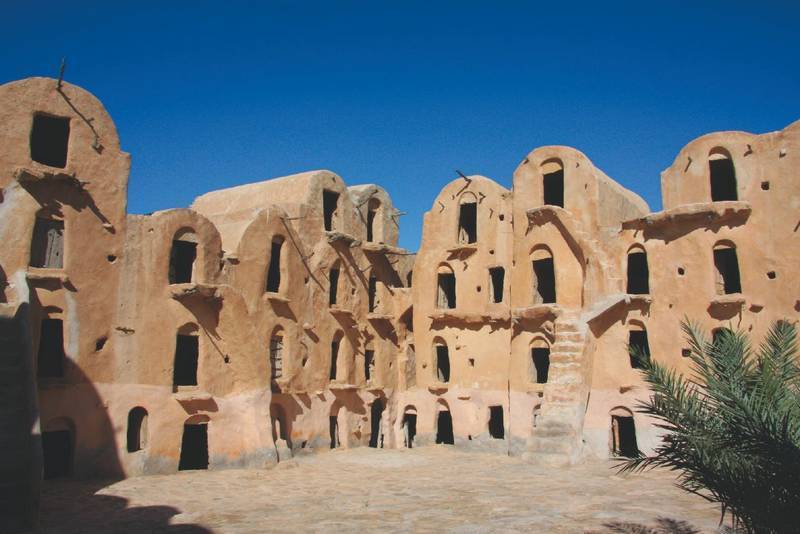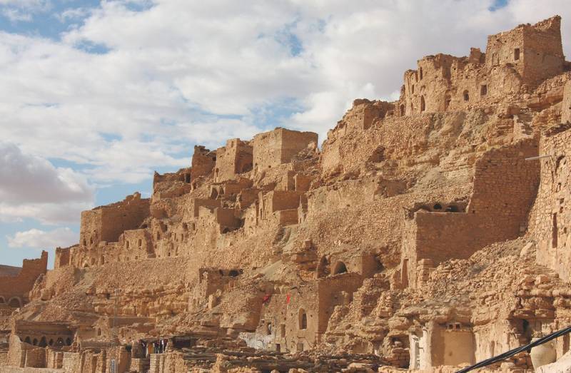 В некоторых районах южного Туниса сохранились уникальные многоэтажные дома-крепости из глины. Снаружи в такую крепость можно попасть только через одни ворота, зато с внутренней стороны стены усеяны входами в комнаты, больше напоминающие ячейки без окон. Лестниц здесь мало, и жителям приходится карабкаться на свой четвёртый этаж, цепляясь за уступы наподобие альпинистских скалодромов. Для пенсионеров предусмотрены льготы: пожилого человека переселяют на первый этаж, а в его квартиру на высоте отправляется новая молодая семья.