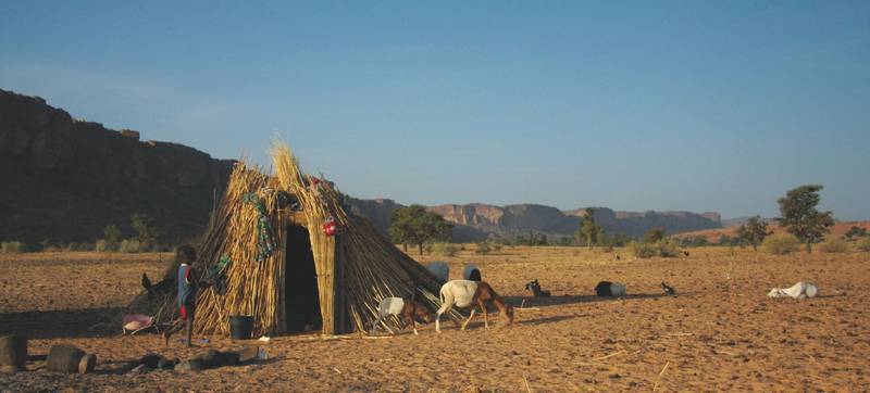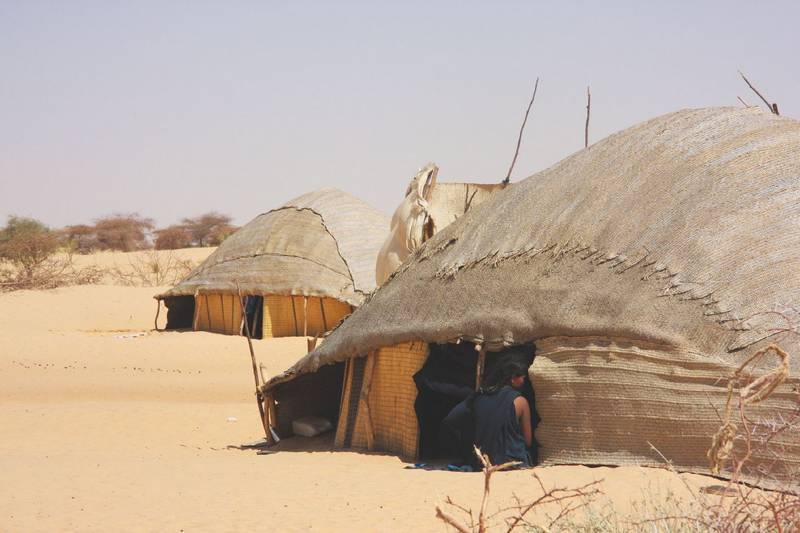 Жители пустынных областей Сахары – бедуины, туареги, афары, мавританские арабы хассания – живут в шатрах, представляющих собой сшитые циновки или верблюжьи шкуры, натянутые на остов из кольев. Такой низкий и широкий фелидж вмещает всю семью и отлично спасает как от палящего солнца, так и от песчаных бурь Сахары. Сегодня среди зажиточных туарегов большую популярность приобретает и брезент, но сами они любят жаловаться – да, европейская ткань практичнее и легче в использовании, но она не «дышит» так, как верблюжья кожа…