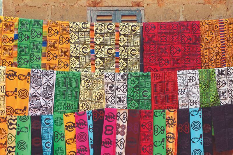 Большой ценностью в Гане считаются и набивные ткани адинкра. Когда-то технику восковой печати завезли сюда из Юго-Восточной Азии, затем она распространилась по территории всей Западной и Центральной Африки. Сегодня эта техника обрела в Гане особую культурную, социальную и экономическую значимость, потому что узоры на тканях адинкра – говорящие. В них зашифрованы пословицы, поэмы и даже элементы эпоса. Каждый символ обозначает определенное слово, понятие, изречение. Знаки в совокупности формируют систему наподобие символического письма, сохраняющую культурные ценности народа акан. Символы адинкра используются и на посуде, в предметах обихода, в архитектуре.