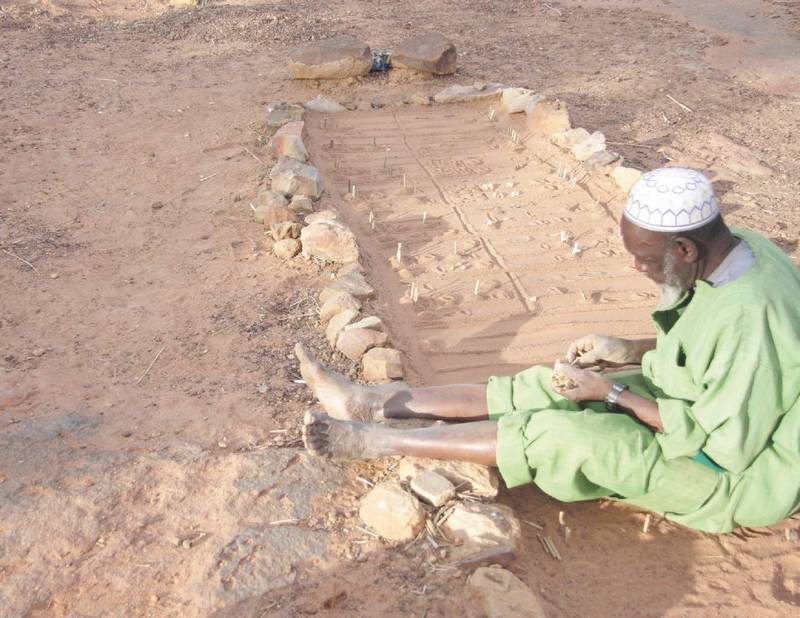 ДОГОНЫ МАЛИ ХОДЯТ УЗНАВАТЬ СВОЮ СУДЬБУ НА ПЛАТО БАНДИАГАРА К АБДАЛЛАХУ – ПРЕДСКАЗАТЕЛЮ, КОТОРЫЙ С ЛЁГКОСТЬЮ ОПРЕДЕЛЯЕТ БУДУЩЕЕ ПО СЛЕДАМ БЛЕДНОГО ЛИСА УРУГУРУ, НЕПУТЁВОГО СЫНА БОГА АММЫ. ПО ВЕЧЕРАМ АБДАЛЛАХ ЧЕРТИТ НА СПЕЦИАЛЬНОЙ ПЛОЩАДКЕ МАГИЧЕСКИЕ ЗНАКИ, СООТВЕТСТВУЮЩИЕ ЗАПРОСУ КЛИЕНТА, И РАЗБРАСЫВАЕТ НА НИХ АРАХИС, А БЛЕДНЫЙ ЛИС ПО НОЧАМ СЪЕДАЕТ ПРИМАНКУ И ОСТАВЛЯЕТ СЛЕДЫ, РАССКАЗЫВАЮЩИЕ О БУДУЩЕМ ЗАЯВИТЕЛЯ. УТРОМ МОЖНО ВЕРНУТЬСЯ И ЗАСТАТЬ ПРОРИЦАТЕЛЯ СИДЯЩИМ НА ПЕСКЕ И РАЗГАДЫВАЮЩИМ ЗНАКИ УРУГУРУ. ОФИС АБДАЛЛАХА РАБОТАЕТ ЕЖЕДНЕВНО, КРОМЕ ПЯТНИЦЫ, ВЕДЬ ОН ПРАВОВЕРНЫЙ МУСУЛЬМАНИН И ЭТОТ ДЕНЬ ПРОВОДИТ В МОЛИТВАХ.