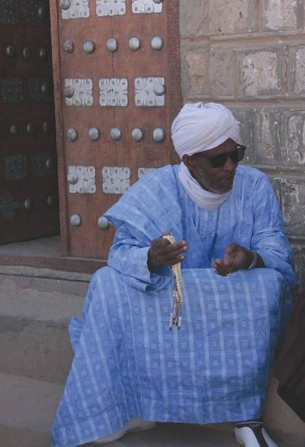 Имам проводит время в философской беседе у входа в свою мечеть в Тимбукту, Мали