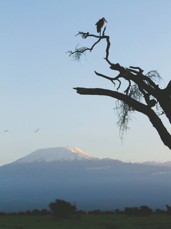 Одинокий марабу любуется закатом на фоне Килиманджаро, Кения