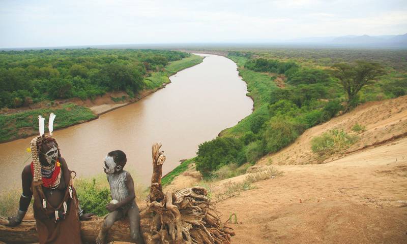 Мама и сын отдыхают на высоком берегу реки Омо, Эфиопия