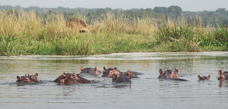 Семейство гиппопотамов отдыхает в Голубом Ниле, Уганда