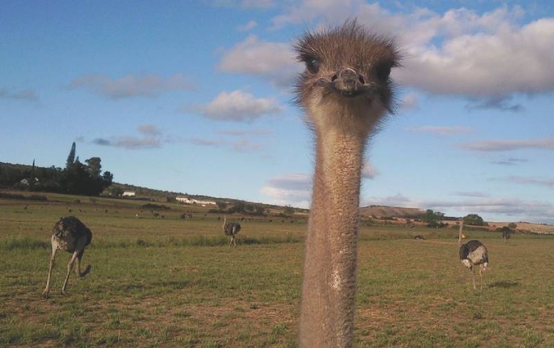 Любопытный страус заглядывает в объектив в одном из национальных парков Намибии