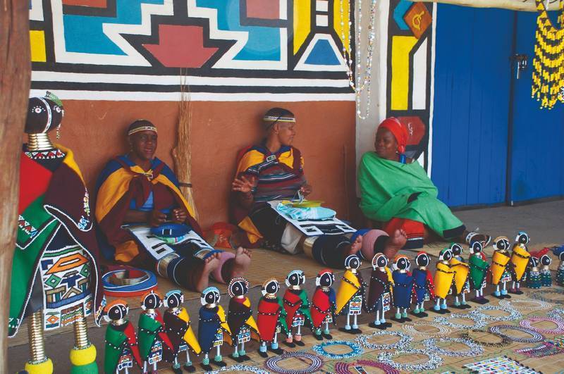Женщины народа ндебеле в традиционных костюмах продают куклы собственного производства