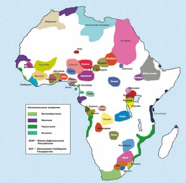 Своеобразную специфику представляли собой государства Южной Африки, созданные белыми колонистами-бурами, – Южно-Африканская Республика (позже Трансвааль) и Оранжевое Свободное Государство; впрочем, они также будут на короткое время присоединены к Британской империи в ходе Англо-бурской войны 1899–1902 гг. Независимость сохранила Либерия – государство, созданное в начале XIX в. освобождёнными в США чернокожими рабами.