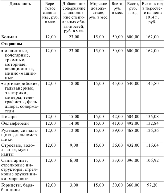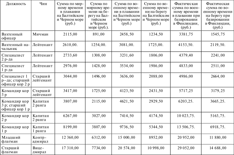 Оклады офицеров изменились не так однозначно. Если для вахтенных офицеров (мичманы и прапорщики) новые оклады немного превышали довоенное жалованье при службе на берегу, особенно если учесть, что квартиру теперь должны были предоставлять «натурой», а не выдавать за нее деньги (около 700 руб. без квартирных в год до войны и 735–885 руб. в год в пересчете на довоенные цены с февраля 1918 г.). Жалованье специалистов и вахтенных начальников осталось примерно одинаковым, а денежное содержание штаб-офицеров и адмиралов значительно сократилось. Например, начальники центральных управлений получали до революции в год около 9300 руб. (10 тыс. руб. полного оклада, которые состояли из 4000 жалованья, 4000 столовых и 2000 квартирных, причем жалованье и столовые облагались вычетом в 8,5 %). Теперь же им полагалось 1117 руб. 33 коп. в месяц, что при пересчете в цены 1914 г. соответствует 1676 руб. в год. Даже если учесть, что квартира теперь предоставлялась натурой, оклад понизился в 4,3 раза. Плавающие флагманы потеряли в оплате еще больше, их жалованье сократилось примерно в 10 раз.