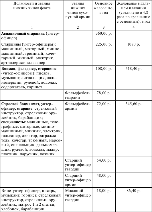 Конкретное представление о выплатах нижним чинам срочной службы дает таблица 4, в которой для сравнения приведены также суммы жалованья в дальнем плавании и оклады сухопутных солдат. Практически не было случаев, чтобы круглый год матрос пробыл в дальнем заграничном плавании, реальный оклад матроса колебался от основного жалованья до жалованья в дальнем плавании. Жалованье авиационных старшин в дальнем плавании не указано, в силу того что авианесущие корабли в дореволюционное время ни одного дальнего плавания в заграничных водах не совершили[354]354