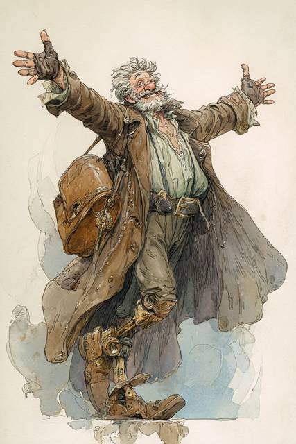 Старик Тит резко отшатнулся назад. Он раскинул руки в стороны и, выстукивая пятками железных ног не хуже моряков в пабе, закружился вокруг.