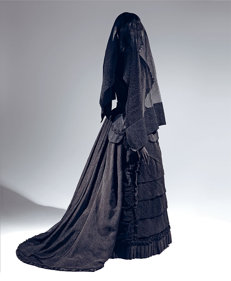 Образ викторианской вдовы был проработан особенно тщательно. Черный креп – гофрированная шершавая шелковая ткань, прошедшая термическую обработку, – повсеместно использовали вдовы с достатком. Также применялась бумазея – менее дорогая смесь шерсти и шелка. Матовая поверхность обеих тканей поглощала свет, подчеркивая скорбь женщины, обязанной носить только черное в течение года и одного дня. Столько же вдова не могла посещать никакие общественные мероприятия и должна была завершать свой строгий образ длинной черной вуалью, закрывающей голову и лицо.