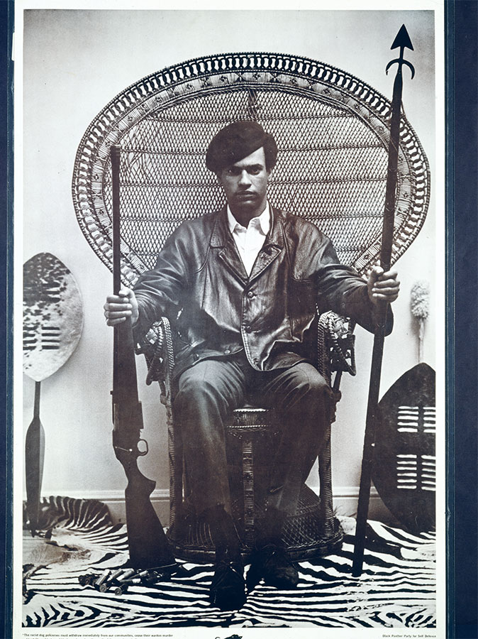 Это изображение министра обороны партии «Черные пантеры» Хьюи Ньютона, сделанное в 1967 году, стало важным символом протеста. Он одет в одежду из черной кожи и окружен символами власти.