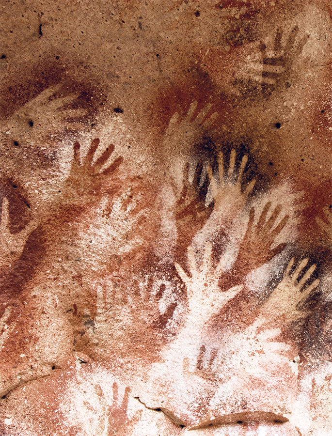 Фрагмент живописи с негативным изображением рук, Куэва-де-лас-Манос (Пещера рук), объект Всемирного наследия ЮНЕСКО, расположенный в долине реки Пинтурас в провинции Санта-Крус, Аргентина. Элементы делятся на несколько стилевых групп, самой древней больше 9 300 лет.