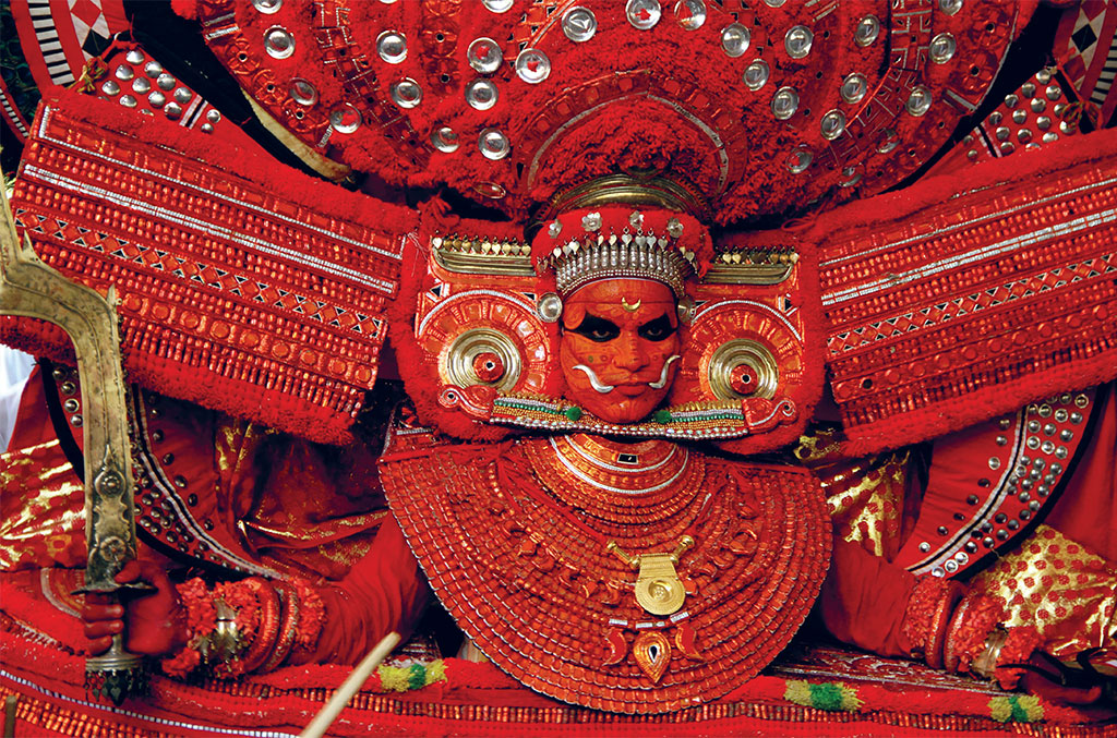 Сегодняшние участники празднества Тейяма – буйно костюмированного танцевального ритуала синкретической индийской народной религии родом из Кералы и соседних областей – приносят в жертву петухов как для того, чтобы умилостивить богов, так и для того, чтобы впитать их свирепость. Здесь в игру вступает преобразующая природа крови; часть пылкой энергии Тейяма произрастает из ритуального разрушения кастовой системы, когда исполнители из низшей касты становятся богами во всей их красоте, мощи и силе. Даже если мы не говорим о крови, красный цвет доминирует в каждом визуальном аспекте ритуалов, корни которых, как считается, уходят в неолитические времена.