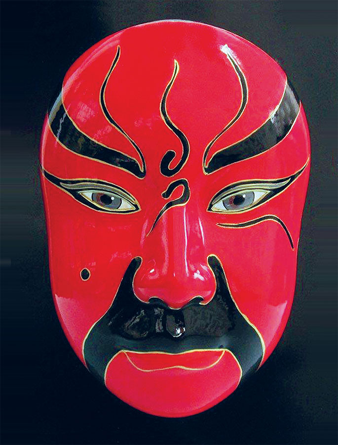 Маска Сычуаньской оперы; изображение Гуань Юя, краснолицего китайского бога войны. Гуань Юй был военачальником в начале III века, сыгравшим значительную роль в гражданской войне, которая привела к краху династии Хань и созданию государства Шу Хань в период Троецарствия.