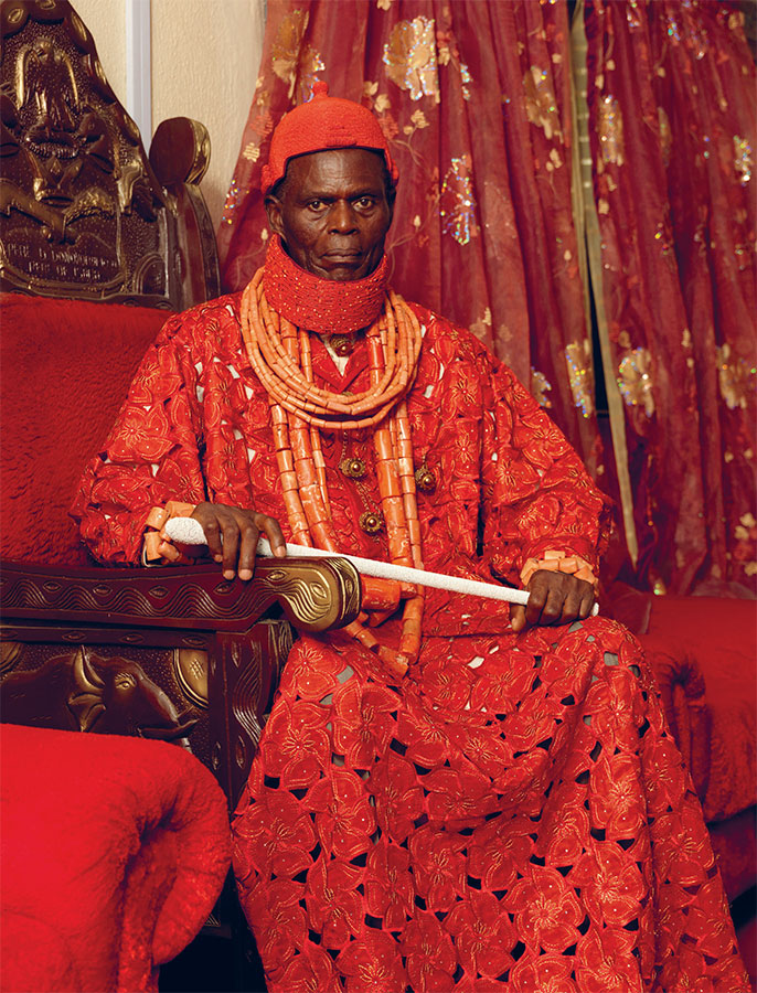 Древняя связь между красным цветом и королевской властью очевидна и сегодня, как видно на этом изображении одного из потомственных региональных монархов Нигерии. Его Королевское Величество Дейнмовуру Донокоромо III, Отец королевства Исаба, Нигерия.