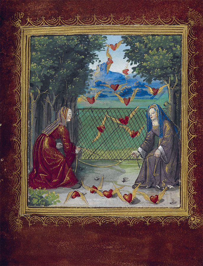 Очаровательная «Маленькая книга любви», написанная в начале XVI века, продолжает развивать символическое изображение сердца. В ней собраны 12 стихотворений и рисунков Пьера Сала, которые он посвятил возлюбленной Маргарите Буйю. На одной из картинок изображены две женщины, которые ловят крылатые сердца, словно бабочек[79]. Они, возможно, более пухлые, чем современные версии, но восхитительно узнаваемые. Французские игральные карты XV и XVI веков позаимствовали идеализированную форму сердца в качестве одной из четырех мастей, заменив чашу (или это был Грааль?) из карточных колод эпохи Ренессанса, использовавшихся в Испании и Италии. Оно задумывалось как легко узнаваемое во время карточной игры в любое время суток как в роскошных дворцах, так и в тускло освещенных притонах, и остается совершенно неизменным и спустя несколько столетий.