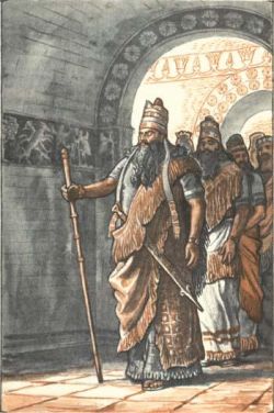Шумукин покорно покидает святилище царя, и вскоре, бесшумно шагая по толстому ковру, входит советник Асархаддона, полководец Белушезиб. Он участник многих сражений. Громадный красный шрам пересек его левую щеку, рот и подбородок и сделал уродливым когда-то красивое лицо.