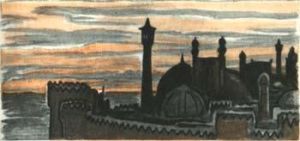 На закате, когда голос муэдзина, всегда пронзительный, а иногда и зловещий, призывал рабов аллаха к молитве и когда все правоверные, живущие в Гургандже, обращали свои взоры к Мекке, ал-Бируни, следуя обычаю всех мусульман, опускался на маленький потертый коврик. Стоя на коленях, он повторял слова вечерней молитвы, всегда одни и те же, давно знакомые и привычные. Без особых мыслей к аллаху, не переставая держать в памяти начатую формулу расчета, ученый выполнял свой долг мусульманина, а затем снова принимался за работу.