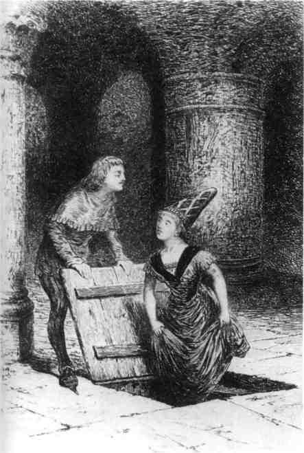 Ил. 12.Теодор и Изабелла в подземельях замка Отранто. Сцена из первой главы «Замка Отранто». Иллюстрация к «парному» английскому изданию «Замка Отранто» и «Старого английского барона» 1883 г.