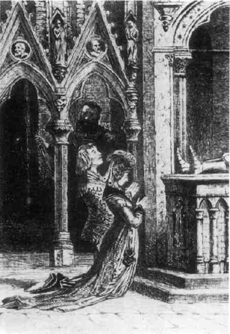 Ил. 13.Теодор, Матильда и князь Манфред у гробницы Альфонсо Доброго. Сцена из пятой главы «Замка Отранто». Иллюстрация к «парному» английскому изданию «Замка Отранто» и «Старого английского барона» 1883 г.