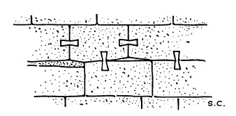 «Ласточкины хвосты» применяли для соединения двух блоков с Древнего царства до недавних времен, но их использовали далеко не всегда, даже в кладке самого лучшего качества. Мы не найдем их ни в Великой пирамиде, ни в самых лучших мастабах. В Храме Сфинкса они встречаются по краям архитравов (рис. 50), где часто сочетаются с нагелями, проходящими в верхнюю часть колонны. Во все эпохи они часто использовались в блоках двойного архитрава (рис. 51). В некоторых зданиях «ласточкины хвосты» имеют очень большой размер. Те, которые соединяют архитравы во Дворе Шешонка I в Карнаке, имеют длину до 1,5 м.