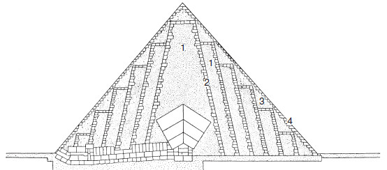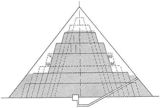 Пирамида состоит из четырех слоев (они изображены на рис. 60): 1) ядро, расположенное между «нарастающими облицовками» и имеющее очень грубую кладку; 2) внутренние облицовки, или «нарастающие облицовки»; 3) поддерживающие блоки, уложенные между последней «нарастающей облицовкой» и блоками внешней облицовки, и 4) блоки внешней облицовки.