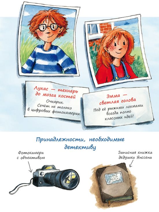Как хорошо иметь при себе «Руководство для настоящих детективов – основные правила» двоюродного дедушки Теодора Янссена. Недолго думая, Эмма с Лукасом приступают к расследованию нового дела. Им помогает девочка с прикольной внешностью – с обритой наполовину головой и серёжкой из крашеных чаячьих перьев. Вместе они не только находят свои велосипеды и выслеживают главаря коварных похитителей, но и спасают жизнь полицейскому.