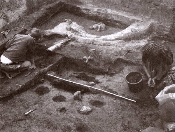 Рисунок 12. Раскопки стоянки Павлов VI в 2007 году (в непосредственной близости от Дольни-Вестонице, Чешская Республика), здесь видны центральный очаг, круглые ямы и кости мамонта. Фото: Иржи Свобода