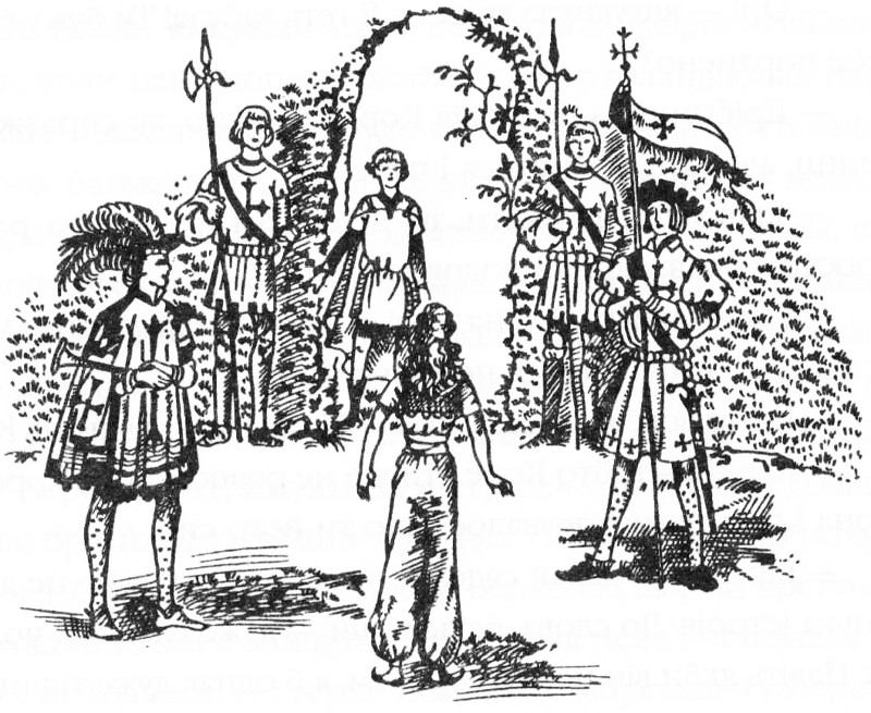 Спершу увійшли два вояки з алебардами і стали обабіч воріт. За ними з’явився вістун, а далі сурмач.