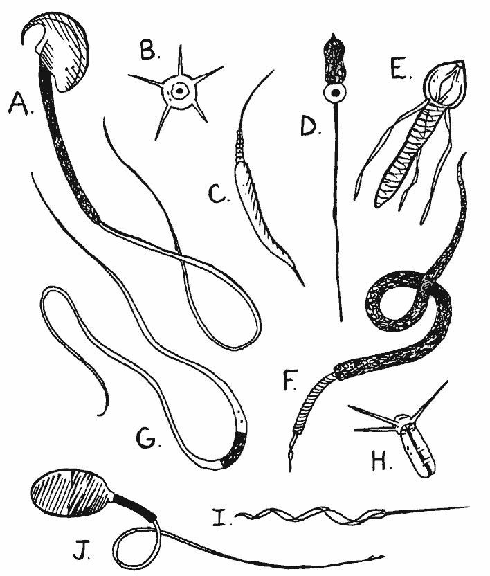 6.2 Сперматозоиды различных животных: A – полевая мышь; B – белоголовая муния; C – сухопутная черепаха; D – осётр; E – неполнохвостый рак; F – скат Raja; G – ехидна; H – омар; I – ворона; J – человек. (Рисунок Мишель Салливан.)