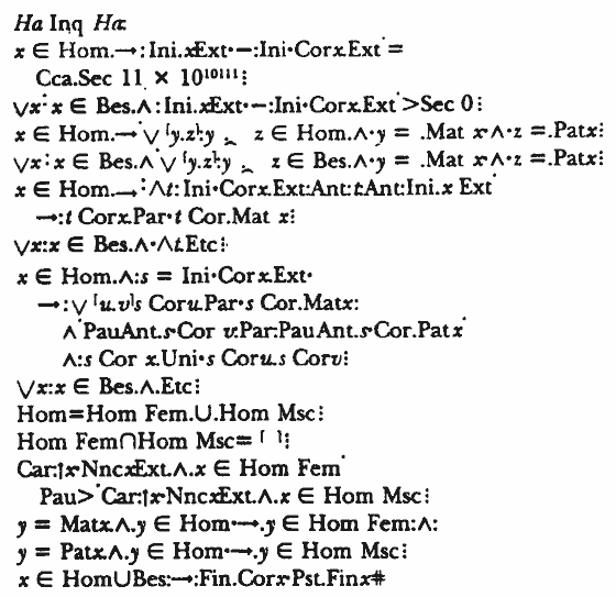 Некоторые астрономы и математики считают, что символическая логика – это лучший способ общения разумных существ из разных звёздных систем. В 1960-е годы Ханс Фройденталь, профессор математики Утрехтского университета в Нидерландах, попытался разработать логический язык, который мы могли бы использовать для общения с разумными инопланетянами, с которыми у нас нет ничего общего. Этот язык называется линкос, что расшифровывается как “lingua cosmica”, и состоит из математических, биологических и лингвистических символов, в том числе некоторых из использованных более ранними математиками-логиками, такими как Альфред Норт Уайтхед и Бертран Рассел. В языке Фройденталя лексика и синтаксис формируются постепенно, начинаясь с элементарных арифметических понятий и переходя к более продвинутым абстрактным идеям. Сможете ли вы расшифровать какое-нибудь из написанных на линкосе сообщений с рисунка 7.2?{54}