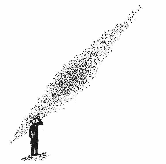 1.13 Галактика Млечный Путь. Здесь астроном смотрит на звёздную систему галактики Млечный Путь, уменьшенную в 100 000 000 000 000 000 000 раз. Голова астронома находится примерно в том месте, которое занимает наше солнце. Млечный путь включает в себя около 40 000 000 000 000 звёзд, распределённых в области в форме линзы диаметром около 100 000 световых лет. (Из книги Георгия Гамова «Один, два, три... бесконечность».)