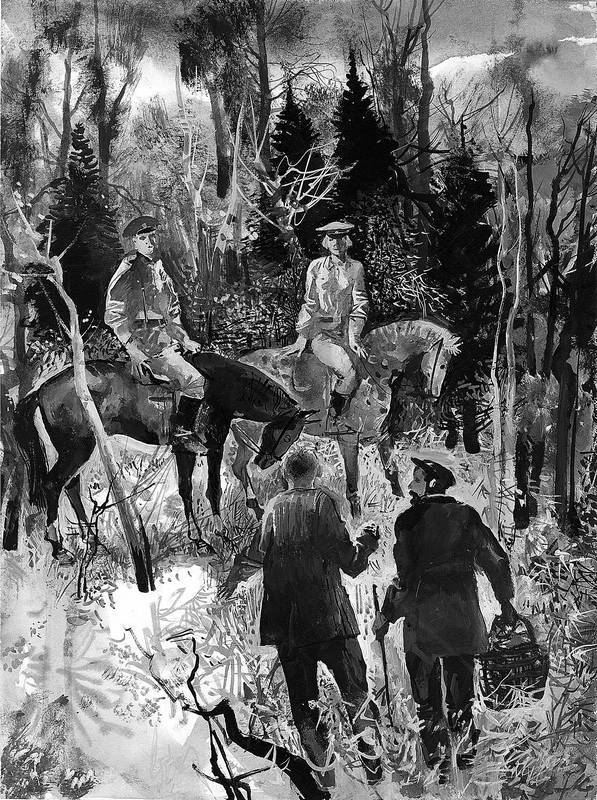 Артём и Василий Петрович в отсыревшей и грязной одежде, с чёрными коленями, стояли на мокрой траве, иногда перетаптываясь, размазывая по щекам лесную паутину и комаров пропахшими землёй руками. Эйхманис и его женщина были верхом: он – на гнедом норовистом жеребце, она – на пегом, немолодом, будто глуховатом.