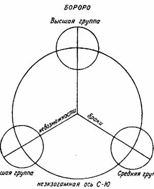 Какую же функцию выполняет здесь большой круг? Его отношение к трем малым окружностям (группам классов) и к трем радиусам (случаи, когда брак невозможен) не оставляет никаких сомнений: он соответствует неэкзогамной североюжной оси, разделяющей в любом поселке бороро кланы перпендикулярно оси псевдоэкзогамных половин на две группы, соответственно называемые «верхняя» и «нижняя» или «с верховья реки» и «с низовья». Я уже не раз отмечал, что роль второго подразделения не ясна [517, с. 231]. Это вполне понятно, поскольку если данный анализ правилен, то напрашивается поразительный на первый взгляд вывод, что северо-южная ось не несет никакой функции, разве что является символом бороро как общества в целом. Рассмотрим схему: три малых круга обозначают эндогамные группы, постоянно находящиеся рядом подобщества, между членами которых никогда не устанавливается никаких родственных связей. Три радиуса не соответствуют какому-либо объединяющему принципу, поскольку, обозначая случаи невозможности брака, они выражают также отрицательную ценность101 внутри системы. Северо-южная ось дает нам единственно объединяющий элемент, однако это нельзя утверждать с полной уверенностью, поскольку значение оси остается двойственным именно в том, каково ее функциональное отношение к месту жительства: она относится ко всему селению, но в то же время делит его надвое.