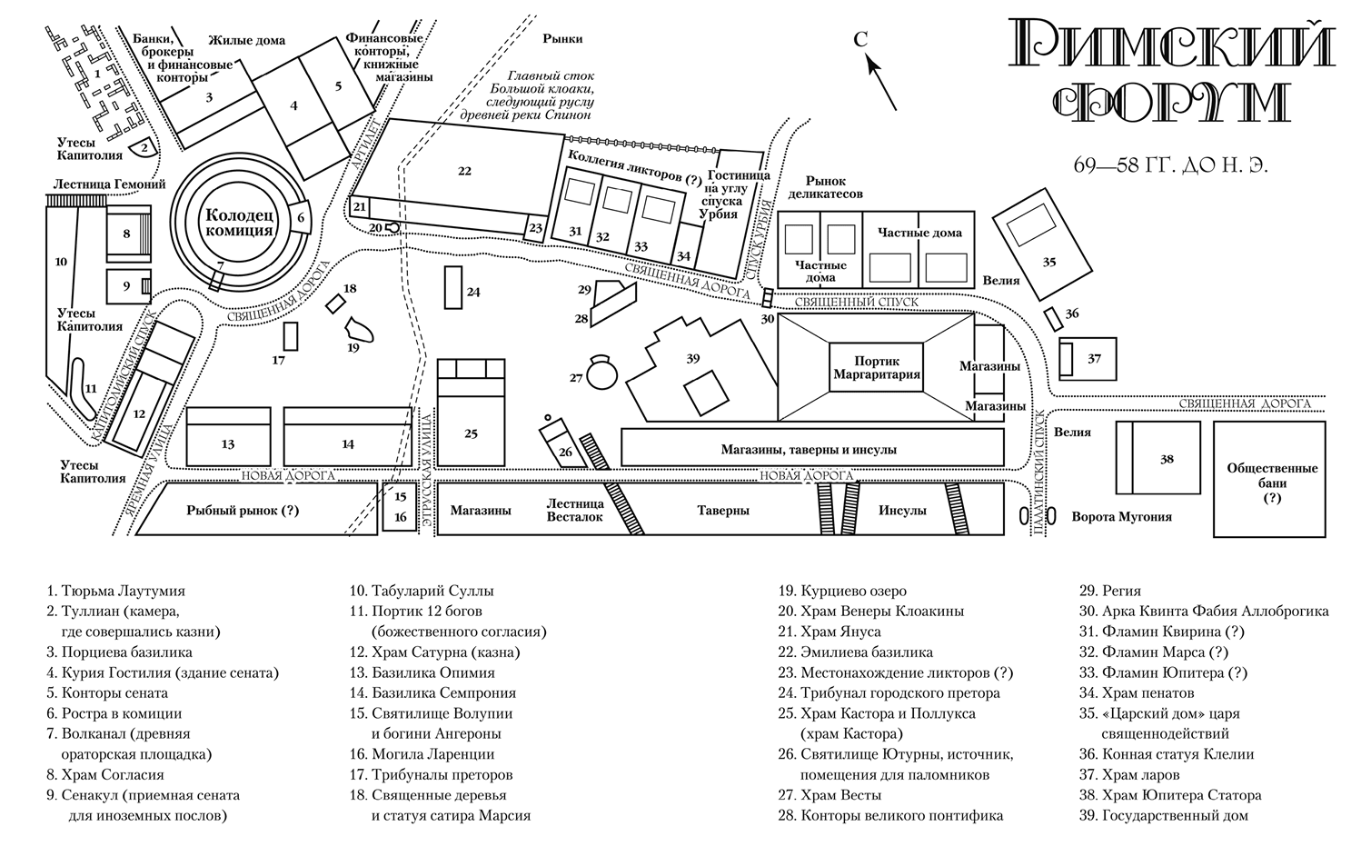 С северной стороны виднелась громада двойной вершины Капитолия, один горб выше другого; множество храмов, яркие колонны, цоколи, позолоченные статуи на крышах, покрытых оранжевой черепицей. Новый храм Юпитера Всеблагого Всесильного все еще строится, недовольно заметил Цезарь (старый сгорел дотла несколько лет назад). Катул не торопится, ему все равно, когда закончат строительство храма. Но огромный архив, Табуларий Суллы, был уже возведен и возвышался в центре переднего склона. Внушительное сооружение со сводчатыми этажами и галереями, способное вместить все архивы Рима, законы, бухгалтерские книги. А в нижней части Капитолия располагались другие общественные здания: храм Согласия, а рядом с ним – маленький старый Сенакул, в котором сенат принимал иностранные делегации.