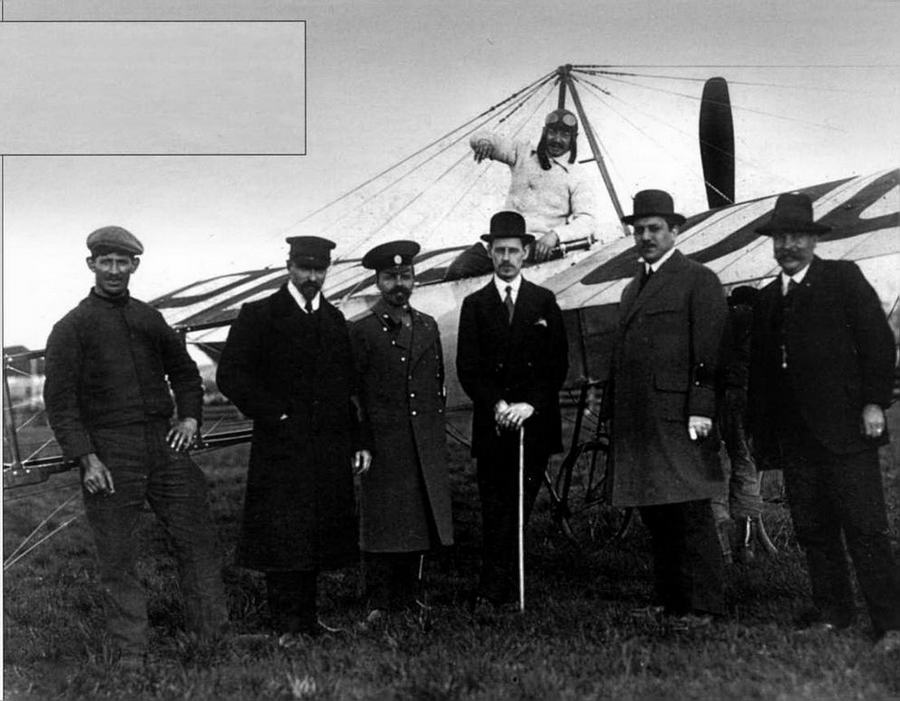 Пегу (в кабине аэроплана) во время гастролей в России, май 1914 г. На верхнем крыле машины крупно написана фамилия летчика. Перед самолетом – группа российских предпринимателей, чиновников и военных