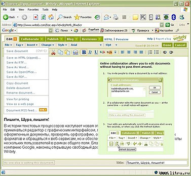 В истории текстовых процессоров наступает новая эпоха. За базовый минимум теперь будет приниматься редактор с графическим интерфейсом, позволяющий не только создавать красиво оформленные документы, проверять орфографию, оперировать с файлами популярных офисных форматов и обращаться к веб-сервисам, но и обеспечивающий возможность совместной работы нескольких пользователей. Благодарить за это следует, понятное дело, компанию Google, наконец открывшую свободный доступ к онлайновому текстовому редактору Writely.