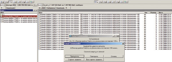 До сих пор для переноса данных кое-где пользуются дискетами. Применяемая на них FAT12 не даст соскучиться любителям длинных имен. Если при соблюдении формата имен "8.3"2 на дискету теоретически можно записать четыре с лишним тысячи файлов, то использование длинных имен резко сокращает адресуемое пространство. В моем тесте на чистую дискету без битых блоков удалось записать только двадцать файлов объемом по 2 байта, но с длиной имени у каждого по 128 символов. Двадцать первый уже не записывался – появлялось сообщение об ошибке и просьба снять защиту от записи, которой, естественно, не было.