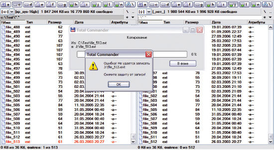 В смоделированной и отображенной на скриншотах ситуации использовалась карта памяти SD емкостью 2 Гбайт, на которой цифровой фотоаппарат создал раздел FAT16. Записанные 512 файлов хоть и занимали суммарно всего 16 Мбайт, не позволяли записать следующий файл или создать пустую папку.