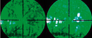 Взгляните на рисунок вверху – слева мы видим картинку, которую дает усилитель яркости. Одна листва. Но вот оператор подмешал с помощью дихроичного зеркала картинку с тепловизора (справа) – и сразу проявляются лицо и руки человека. Даже если их раскрасили защитной краслкой… Так что сегодня бессмысленно говорить о характеристиках собственно оружия. Значение имеет лишь то, какие результаты оно обеспечивает с ночным прицелом!
