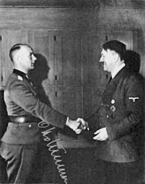 Гитлер вручает Отто Кумму Рыцарский крест с дубовыми листьями, апрель 1943 года. Кумм уже носит петлицы штандартенфюрера СС, которые он получил буквально за несколько дней до церемонии.