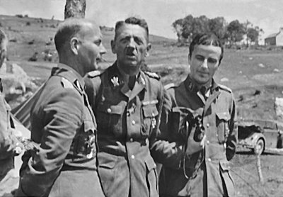 Начальник штаба 7-й добровольческой дивизии СС «Принц Евгений» штандартенфюрер СС Отто Кумм, его командир – обергруппенфюрер СС и генерал войск СС Артур Флепс и гауптштурмфюрер СС Эрих Эбергардт, июнь 1943 года.