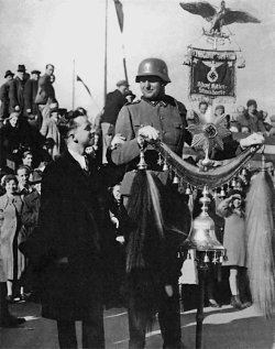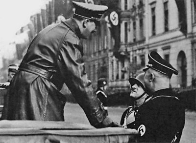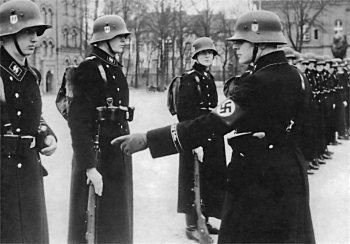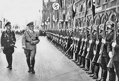 Празднование четвертой годовщины «взятия власти», парад 30 января 1937 года. Адольф Гитлер приветствует командира «Лейбштандарта» Зеппа Дитриха (в каске), спиной стоит рейхсфюрер СС Генрих Гиммлер.