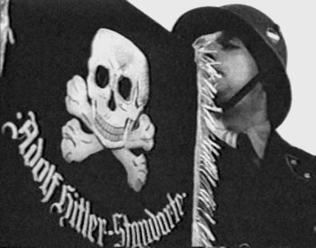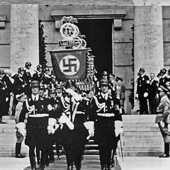 Знаменная группа «Лейбштандарта» у нового здания Имперской канцелярии в Берлине. Белые ремни носили только военнослужащие этого соединения.