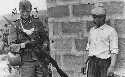 Балканская кампания 1941 года. Унтершарфюрер СС из отряда фельджандармерии «Лейбштандарта СС Адольф Гитлер» осматривает винтовку, конфискованную у местного населения. На груди у унтершарфюрера горжет фельджандармерии (вариант для СС), на левом рукаве – две манжетные ленты: верхняя фельджандармерии, нижняя «Лейбштандарта».