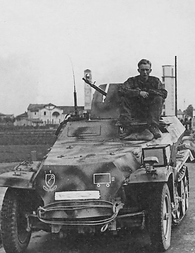 Полугусеничный бронетранспортер SdKfz 251, входящий в «Лейбштандарт» во время военных действий в Нормандии, август 1944 года. Хорошо видны эмблемы на бронетранспортере: слева – эмблема «Лейбштандарта», справа – показывает принадлежность ко 2-му батальону 1-го моторизованного полка СС (о номере полка говорит цифра над левой эмблемой).
