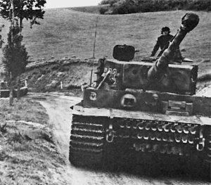 Танк PzKpfw VI «Тигр» из состава 101-го тяжелого танкового батальона СС, приписанного к I танковому корпусу СС и ведущему свою историю от «Лейбштандарта». Слева на броне – эмблема батальона (перекрещивающиеся ключи), очень напоминающая эмблему «Лейбштандарта». Нормандия, август 1944 года.